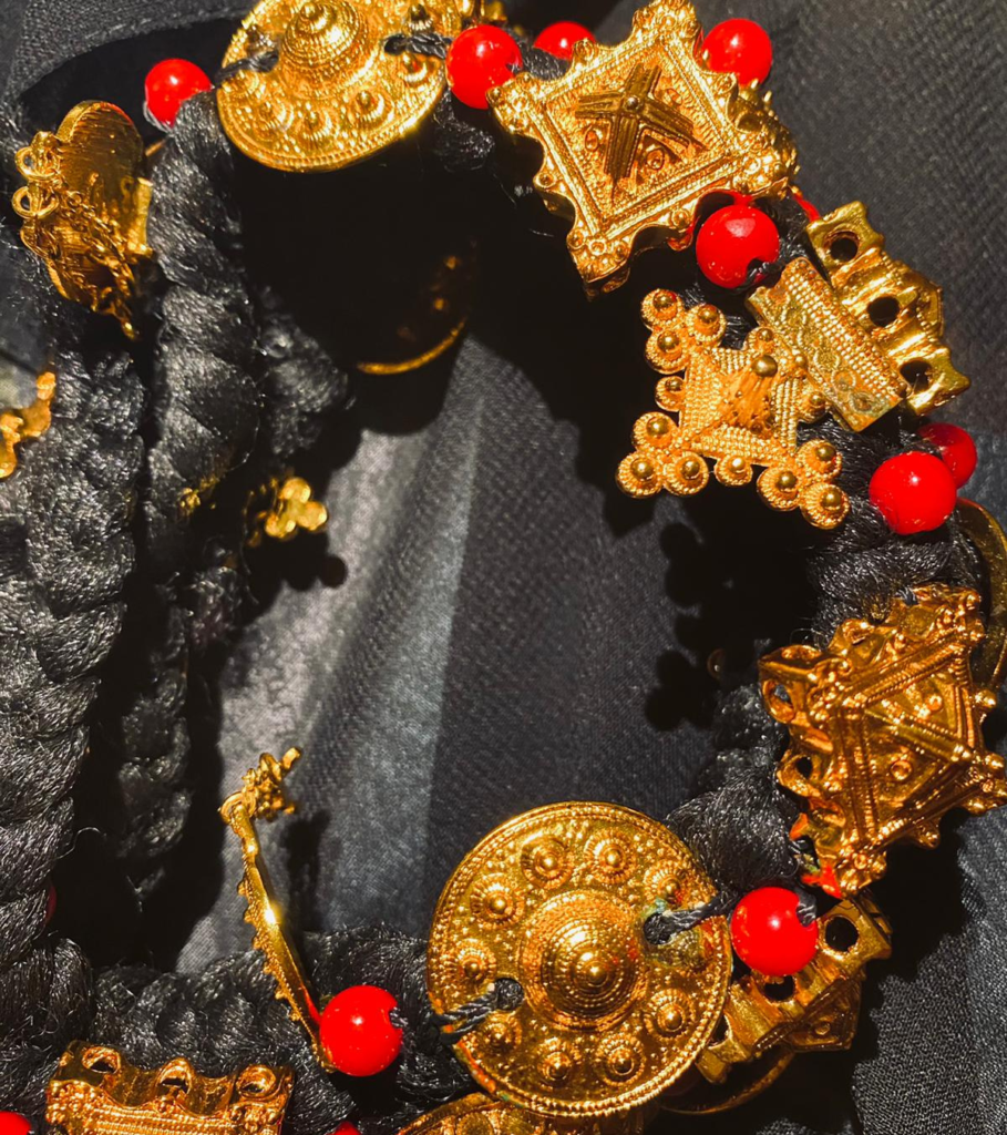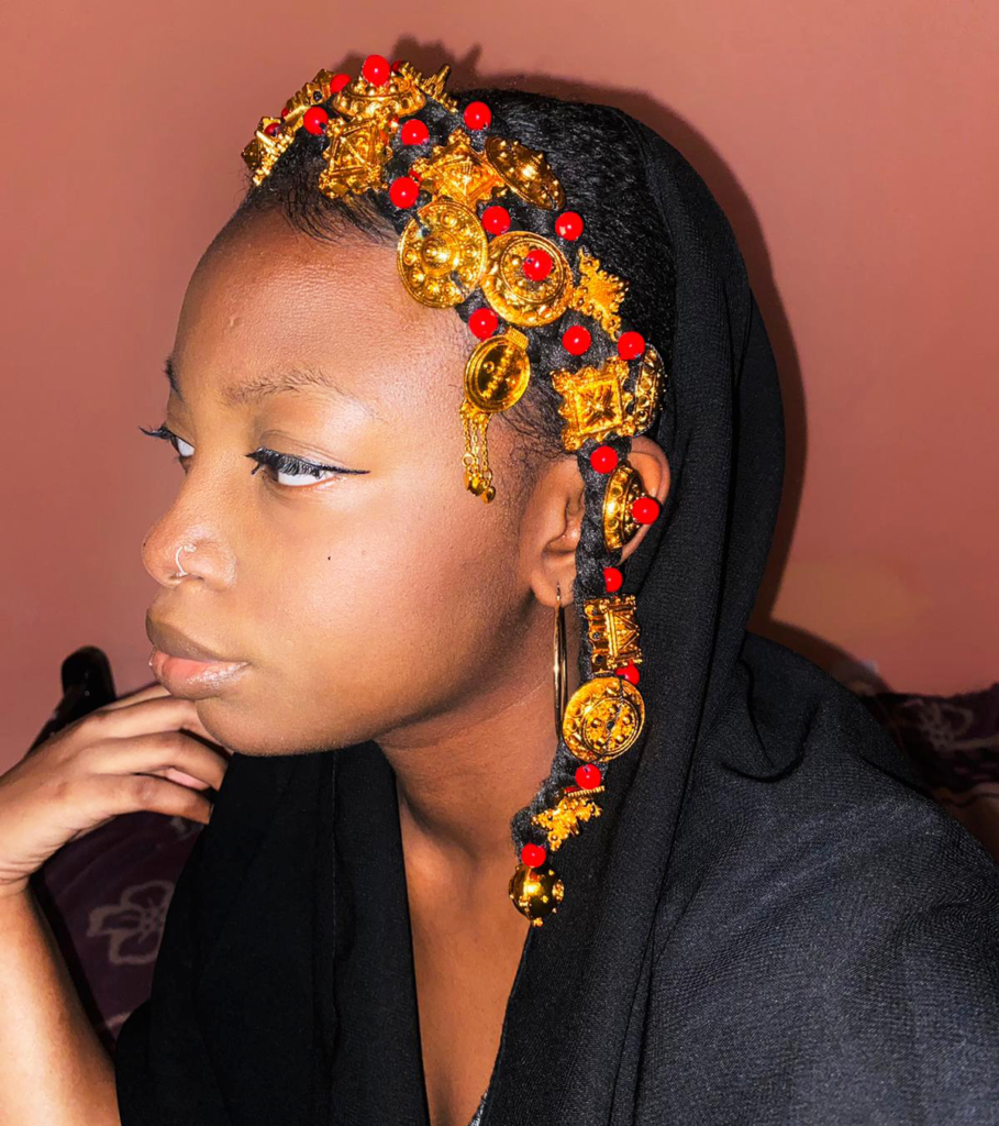 « Normalement, on fait des tresses, puis on coud les pièces en or sur la tête de la jeune fille. Mais comme tu peux le voir, aujourd’hui on a plus trop le temps pour tout ça. Donc, la coiffure se présente sous forme de « perruque » déjà faite. Il te suffit de la mettre sur tes cheveux et de l’attacher avec des épingles. Chaque pièce est normalement en or. On appelle ces pièces zakat.»